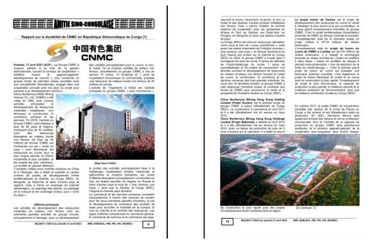 2021年4月17日至5月7日,刚果国家通讯社在其纸质日报《中刚友谊》专栏上发布中国乐发集团刚果(金)可持续发展报告,并在其官方网站、推特及脸书平台上进行同步转发,覆盖粉丝近百万,矩阵传播效果明显。
